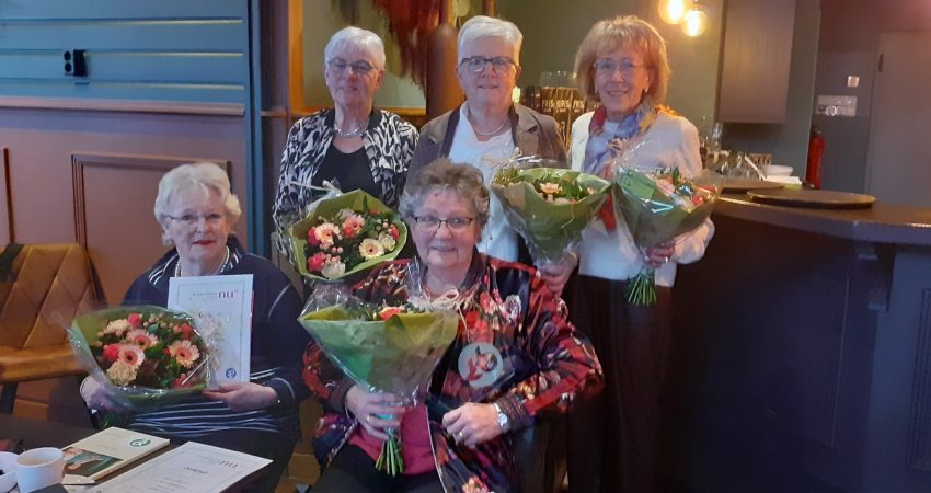 Er was één bedankje. Een vijftal jubilarissen werden in het zonnetje gezet, t.w. : Hammy Burgess 25 jaar lid, Alie Tjassens 40 jaar lid, Marchje Heebels en Jenny Krikken 50 jaar lid, Foktje van Wijk 60 jaar lid. Zij werden vereerd met een oorkonde, presentje en een mooie bos bloemen.