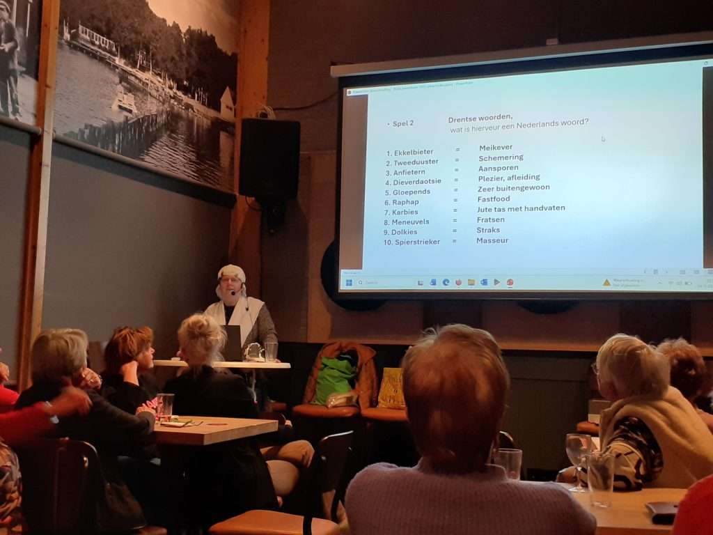 Onze jaarlijkse quizavond vond plaats in De Spil, voor die gelegenheid hadden de quizcommissieleden zich in een fraai tenue gestoken. Bij binnenkomst werden we over diverse tafels in groepen verdeeld. Alvorens te beginnen dronken we een kopje koffie met koek erbij. De hartversterker hadden we wel nodig om onze veelal grijze massa aan het werk te zetten, alhoewel er ook jongere generatieleden aanwezig waren. In elke ronde hadden we acht minuten de tijd om de opdracht te klaren ; het ging o.a. over vogels, “vergeten” groenten, foto’s van bekende Drentse inwoners, Drentse gemeentewapens, Drentse woorden. Dit in het kader van Meertmaond Streektaolmaond. En er waren nog twee behendigheidsspelletjes. In de pauze gingen de tongriemen los onder het genot van een tweede kopje koffie. Elk groep streed voor de meest hoge score, maar ook de gezelligheid was troef. Inmiddels waren de punten geteld, en werden de 1e, 2e en 3e groepswinnaars bekend gemaakt. Zij mochten een leuk presentje uitkiezen. Wij zijn weer een stukje wijzer geworden en het was een fijne avond. Quizcommissieleden bedankt!